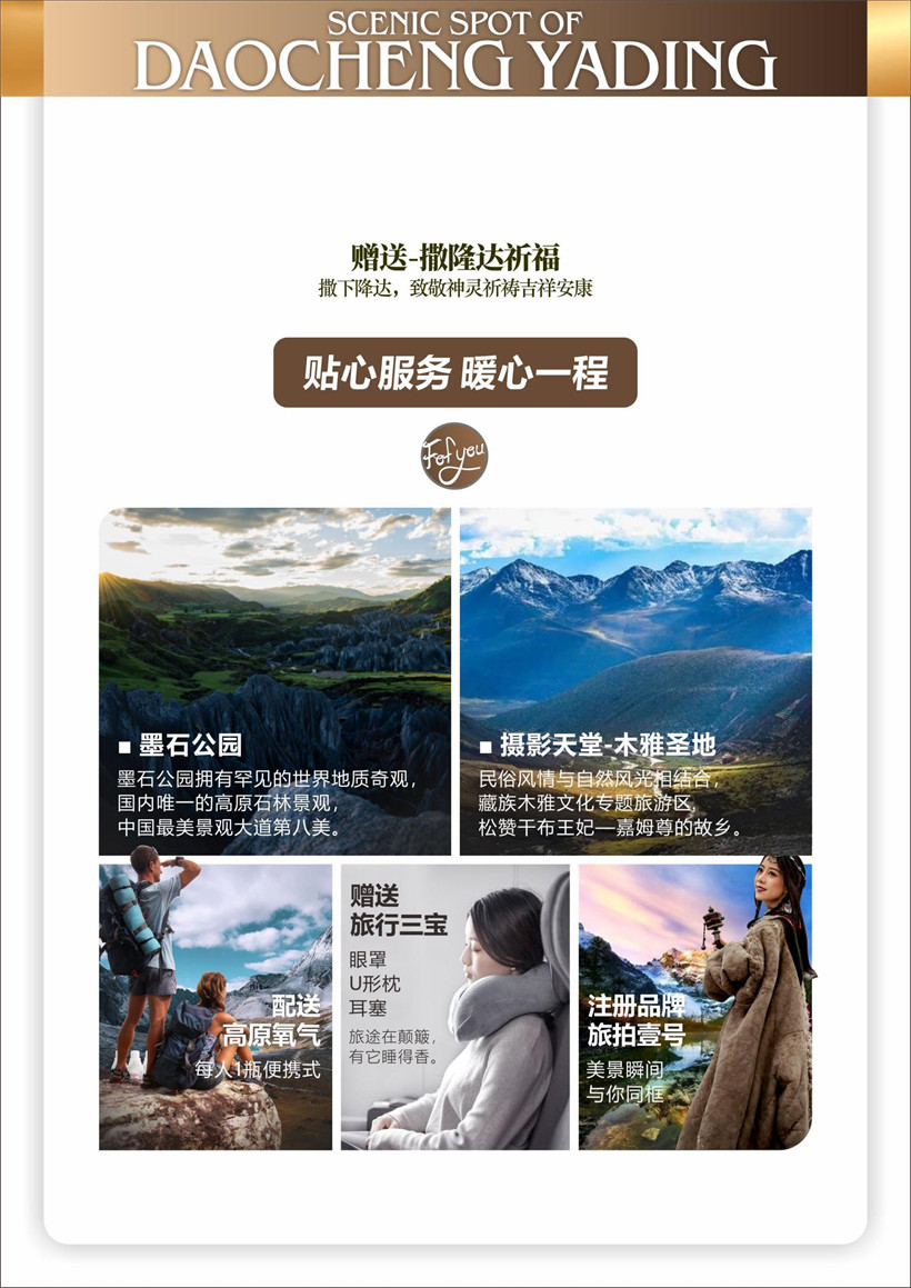 3、门票:墨石公园景区门票(赠)、亚丁景区门票、木雅圣地景区门票(赠),全程景区门票已按 旅行社协议核算,故优惠票不退,免票退 80 元/人