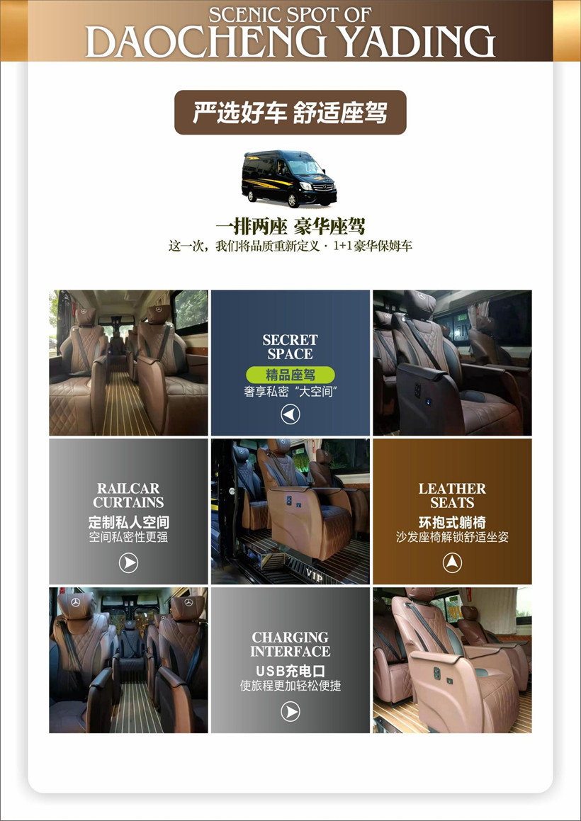 地面交通:根据人数安排用车,5 座/7 座/9 座, 1+1 式豪华头等舱,航空座椅,倾斜度 达到最符合人体力学的 120 度。(车型最后一排为 3 座,应急安全门及最后一排座椅无法 调整,敬请理解!)