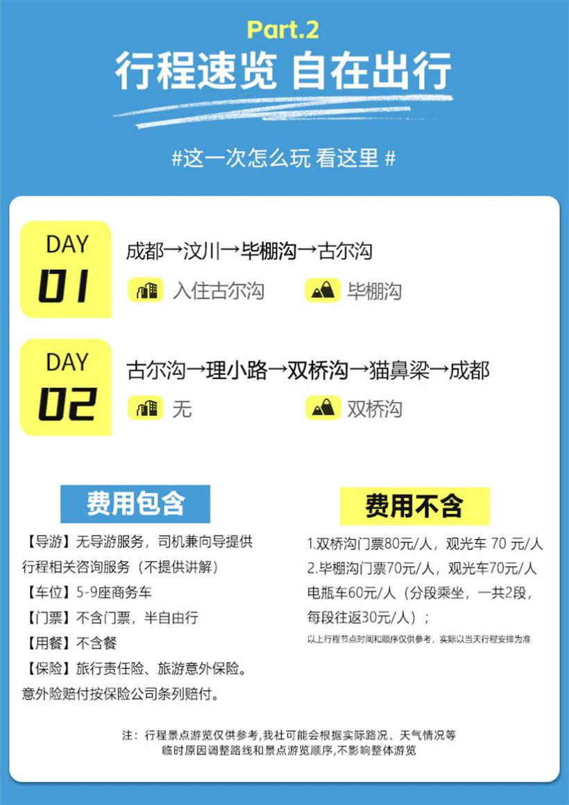 1、景区自费: 1.全程门票、景交费用参考:双桥沟门票 80 元/人,观光车 70 元/人;毕棚沟门票 70 元/人,观光车 70 元/人,电瓶车 60 元/人(分段乘坐,一共 2 段,每段往返 30 元/人);