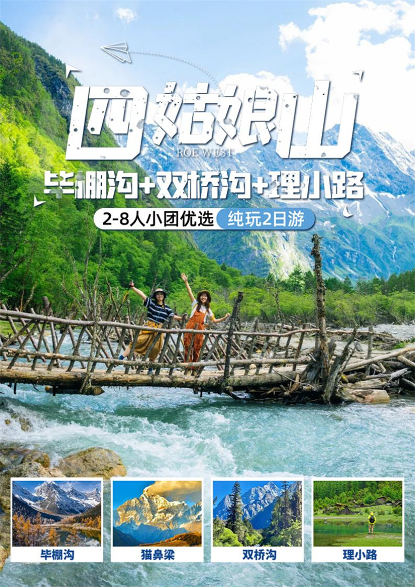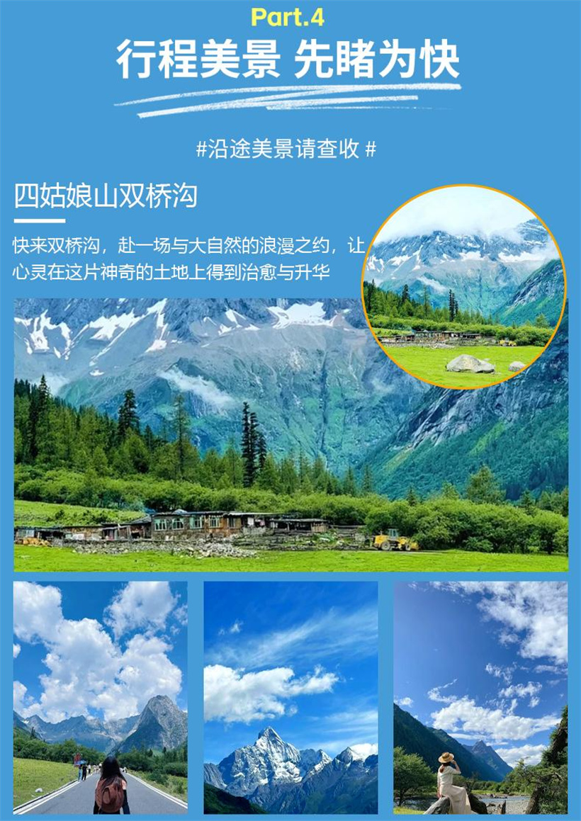 ★早上 07:00 从酒店出发,前往双桥沟,经川版独库“理小路”前往古尔沟;“理小路”是离成都最近的 一条全新的雪山自驾线路,它地处米亚罗省级自然风景保护区和四姑娘山自然保护区结合部拥有雪山、森 林、河谷、冰川、草甸等各种川西经典元素,是名副其实的雪山下景观大道! 中午 11 点左右到达四姑娘山镇,进入四姑娘山双桥沟游览;【双桥沟】(景区门票 80 元/人费用自理,观 光车 70/人自理)全程 34 公里;乘观光车游玩,在景点有车站,需到站上下车,每辆观光车上均有讲解 导游,因每位游客在每个景点停留的时间不一样,很容易走散,故在景区内导游不可能陪到每一位游客,请 各位游客理解!)双桥沟沟内主要以雪峰、牧场、草地、森林等为主,是四姑娘山最美丽的一条沟。漫步 沟内,可体验到真正的牧区风光。主要景点有阴阳谷、猎人峰、日月宝镜和五色山沙棘林道、牛棚子、牛 心山等景点等。游览时间约 4 左右小时。 游览完后,按约定时间出景区后开始返程,中途经过猫鼻梁(停车游览 20 分钟左右)。 最后到达成都散 团。