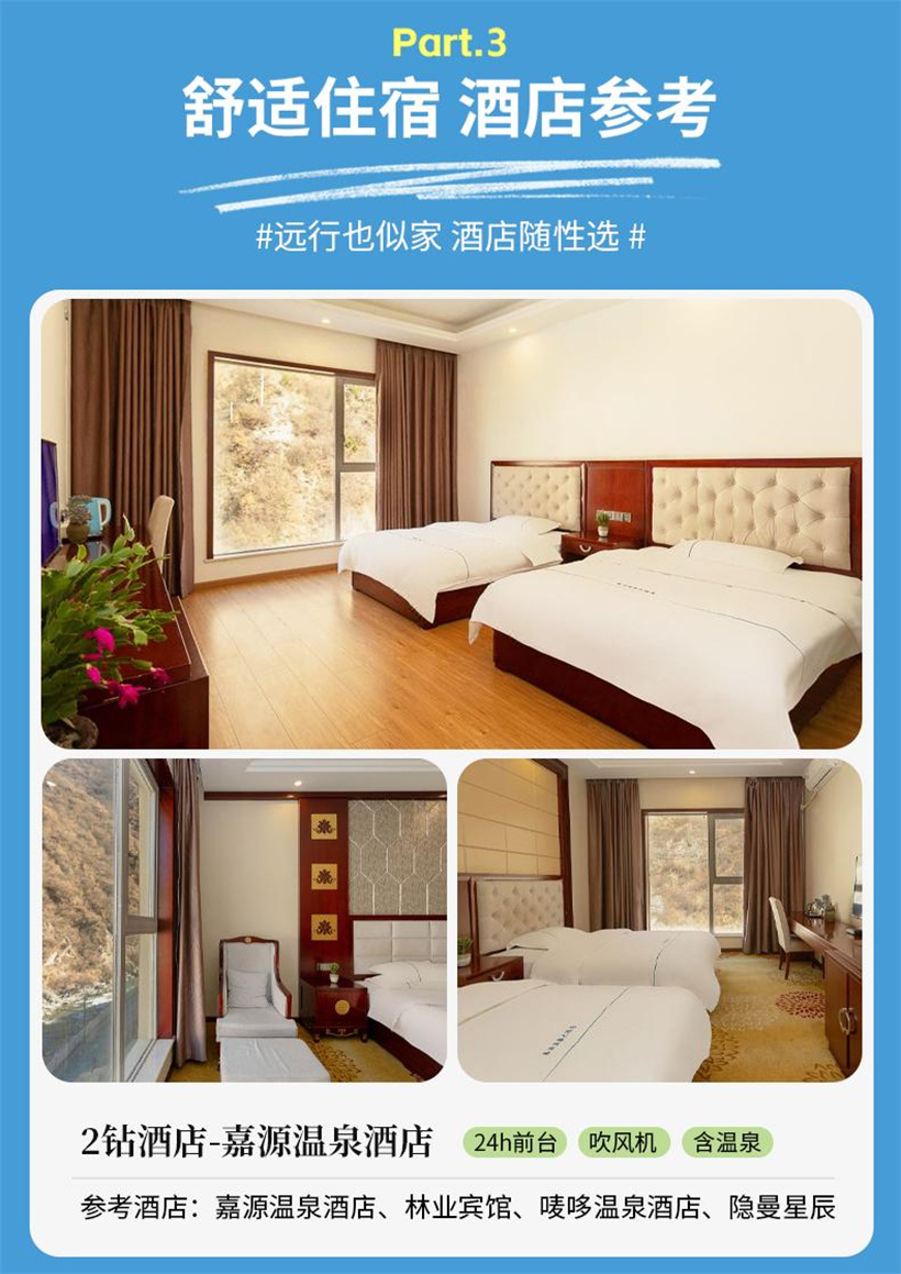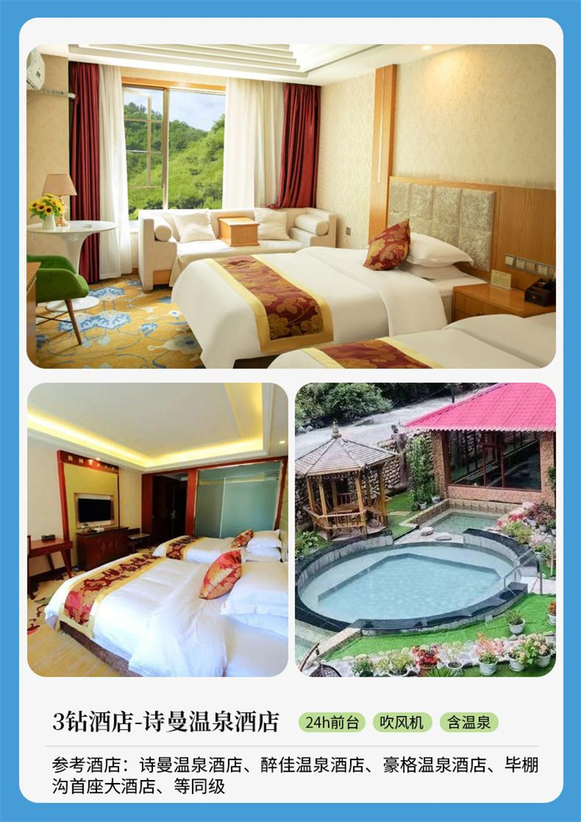 ★游览完,按约定时间出景区,前往酒店安排入住特色温泉酒店。