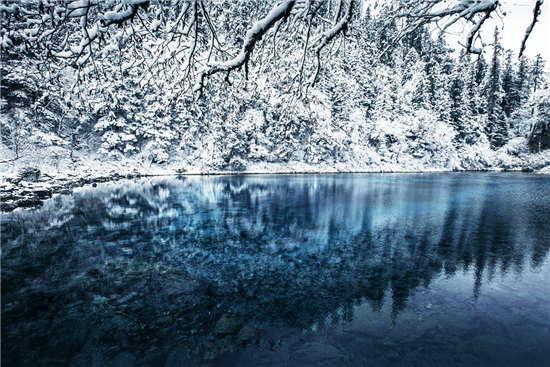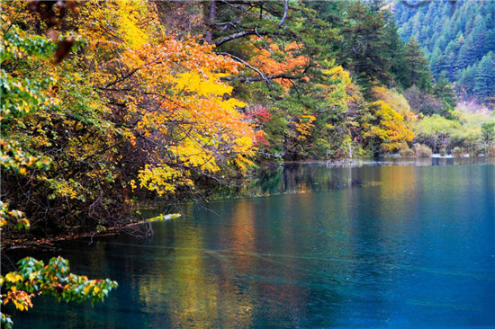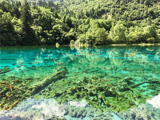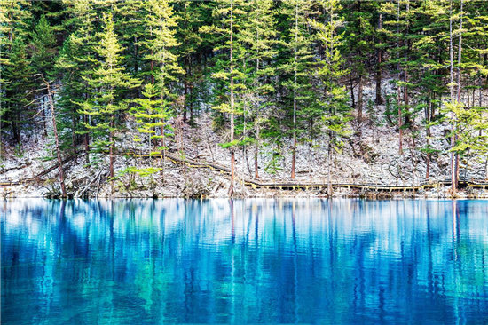 老虎海的湖水因钙华呈现蓝色,由浅蓝到宝蓝再到深蓝,色彩变化均匀,十分好看。水质透亮,倒伏树木清晰可见,这些树木历经千年,倒伏后因表面被石灰质包裹,并未腐朽,所以长久保持原始形状。等到秋天树叶黄了,倒映在海子里就像老虎身上的斑纹才好看