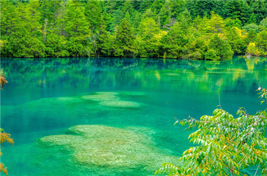 五彩池池底砾石棱角,岩面纹理,一一分明,池水蔚蓝宝绿,明澈透亮。湖里生长着水绵、轮藻、小蕨等水生植物群落,同时还生长芦苇、节节草、水灯芯等草本植物。这些水生群落所含叶绿素深浅不同,在富含碳酸钙质的湖水里,能呈现不同的颜色。同一湖泊里,有的水域蔚蓝,有的湾汊浅绿,有的水色绛黄,有的流泉粉蓝……变化无穷,煞是好看!