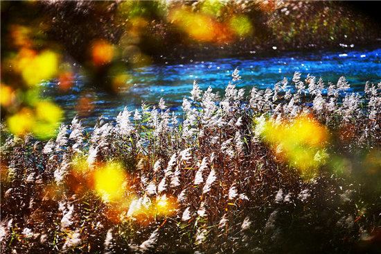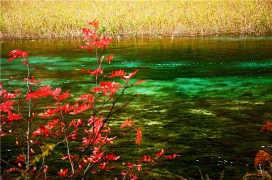 芦苇海的尽头,河道渐宽,芦苇不见,取而代之的是一团团、一簇簇散落在浅滩上的树丛,便是九寨沟的第一个风景——盆景滩。盆景滩又称“盆景海”藏语称“甲珠措”,是进入九寨沟的第一个滩流景观。