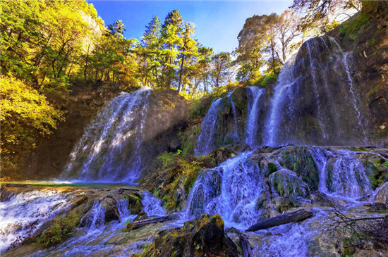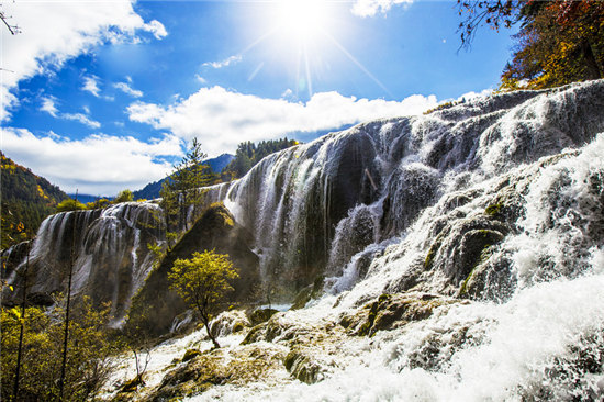 清晨,阳光照耀,瀑面上常可看见一道道彩虹横挂山谷,为瀑布更添一份迷人丰姿。寒冬时节,瀑布就成了一幅巨大的冰幔,无数的冰柱悬挂在陡崖之上,成为一个罕见的冰晶世界,造型各异的冰雕迎光透着幽幽的蓝色魅惑,这也是九寨沟六绝之一:蓝冰