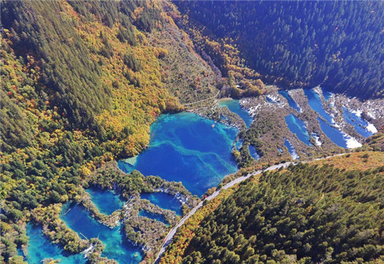 40多个湖泊,犹如40多面晶莹的宝镜,顺沟叠延五、六公里。水光潋滟,碧波荡漾,鸟雀鸣唱,芦苇摇曵。盆景海、芦苇海、火花海、卧龙海、树正瀑布、老虎海。一路惊奇,一路美景,一路碧水,一路瑶池。