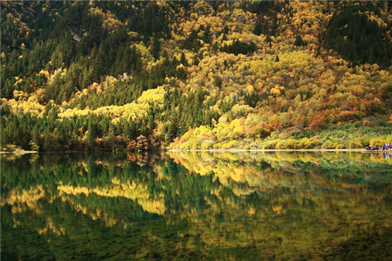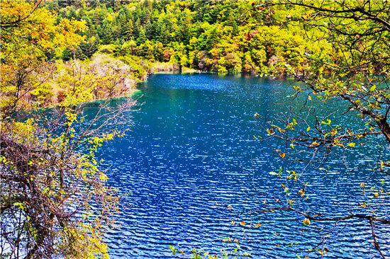 远远而来,映入眼帘的,是五花海怀抱中那青绿、墨绿、深蓝、藏青、金黄,还有一些说不清道不明的色彩拼成的层次清晰的斑斓倩影,相互错杂却不混沌,相互映衬却不侵蚀,相互点缀却不排挤,美不胜收,恰到好处。