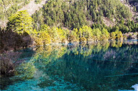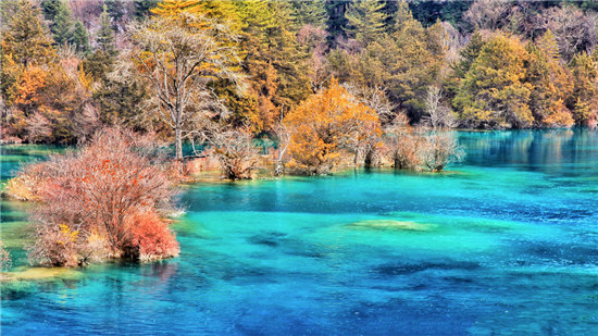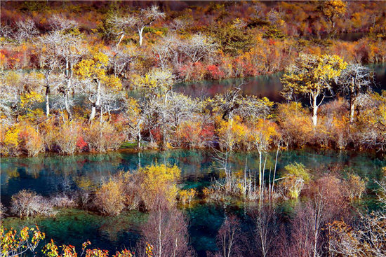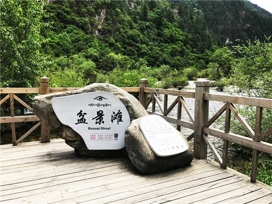 盆景滩里的乳白色钙华浅滩上,生长着多种植物,河水清澈,抹滩流淌,杂树衬缀其间,盘根错节,一树一景,各异其趣,如盆景罗列。盆景滩的的奇景正是九寨沟海子的另一桩别处不见的神奇之处,就是海子当中千奇百怪的树枝树干。由于自然变异,这些树都生长出了能够直接从水中汲取养分的根须。