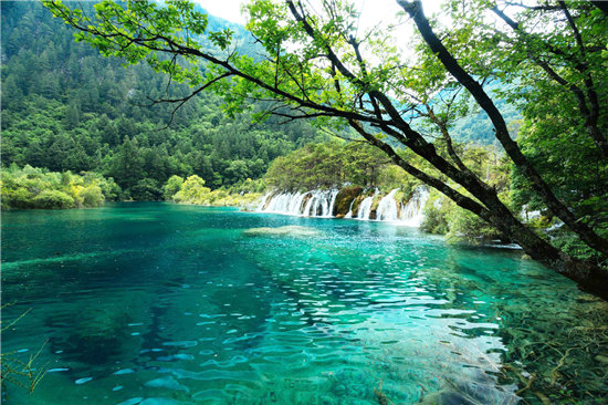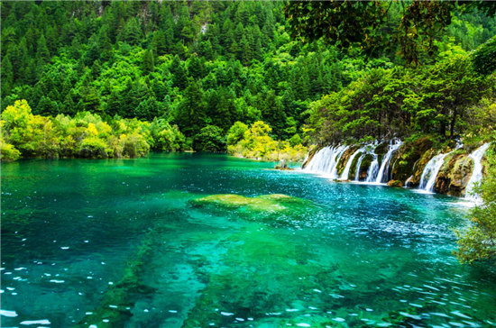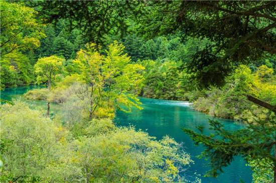 树正群海由大小19块海子所组成,19块海子就如19块碧绿的翡翠,镶嵌在这深山幽谷之中,中间由绿树、银色的小瀑布相连,就如给树正寨带上了一条美丽的翡翠项链。