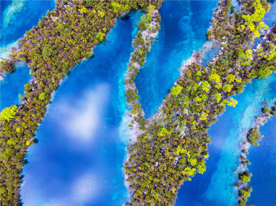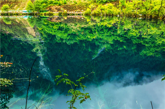 双龙海周围有无数高大树木的环抱,水底有大量枯木断枝的沉淀,在靛蓝色的水面上,一根根深黄色的枯木还萌发出一丛丛精致优美、青翠欲滴的植物,可谓枯木逢春犹再发,一派生机勃勃的景象,让人感受到自然的力量与历史的痕迹。