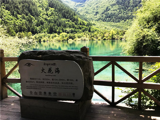 火花海又称火花池,所处位置海拔2187米,长205m,均宽177.33m,均深9.66m,面积36352.6㎡。位于双龙海与卧龙海之间,湛蓝色的水面上波平如镜。海子的四周是茂密的树林,湖水掩映在重重的翠绿之中,像是一块晶莹剔透的翡翠。每当晨雾初散,晨曦初昭时,湖面会因为阳光的折射的作用,水面似有朵朵火花燃烧,星星点点,跳跃闪动。因而得名火花海。九寨沟像“Y”,而火花海是下面的一竖的上半部分
