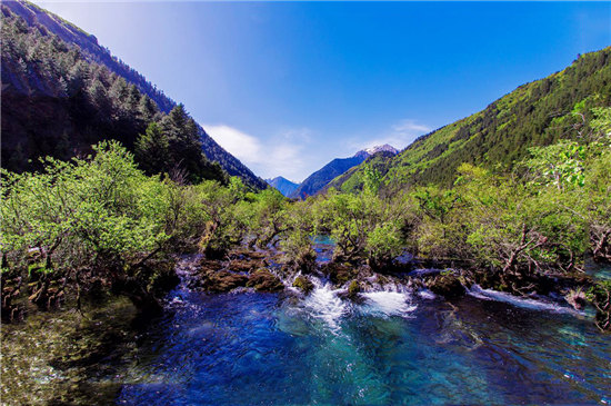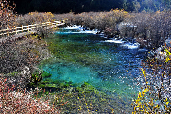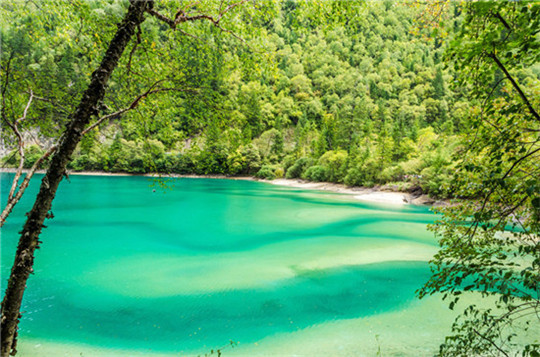 盆景滩,更像是无数的盆景散落在浅滩之中,或张扬婆娑、或简洁修长、或盘曲如龙、或探水如虹,万般姿态,千奇百怪!盆景滩是九寨沟立体的轻音乐,悦耳的流水声,鸟啼声和一座座妙趣横生的盆景交织在一起,构成宁人心动的天籁,要人遐思。