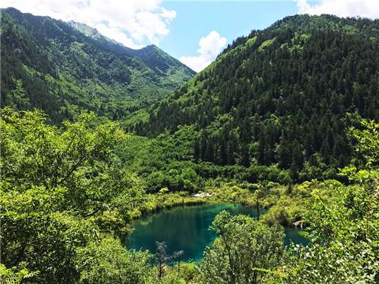 相较其他海子来说,双龙海略显隐蔽,它被郁郁葱葱的树木挡住,而如果你步行在林间栈道中,双龙海便会向你露出它美丽的身姿。