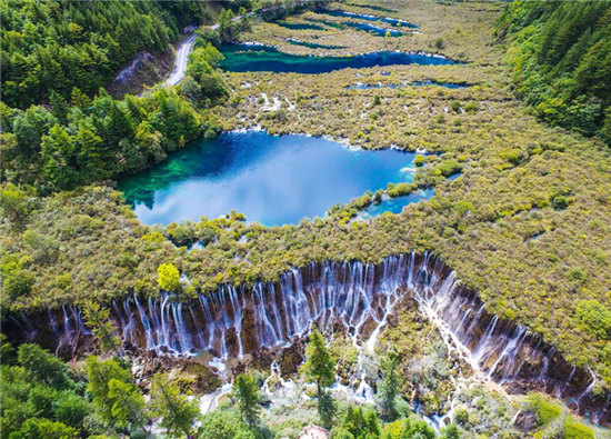 树正群海沟全长13.8公里,共有各种湖泊(海子)40余个,约占九寨沟景区全部湖泊的40%。上部海子的水翻越湖堤,从树丛中溢出,激起白色的水花,在青翠中跳跳蹦蹦,穿梭奔窜。水流顺堤跌宕,形成幅幅水帘,婀娜多姿,婉约变幻。整个群海,层次分明,那绿中套蓝的色彩,童话般的天真自然。