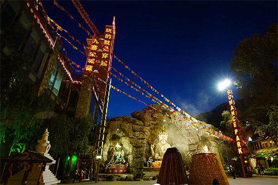 白天的九寨沟自然美好,夜晚的九寨沟妖冶迷人。九寨宋城旅游区一定是你夜游九寨不可错过之地,这里有色嬷女神广场、唐卡谷、藏碉、羌寨、茶马古道、马帮广场、马帮驿站、川西街、水街、酒吧街,同时还会不定期有古今人物快闪穿越、藏羌歌舞、抛彩球、藏族傩戏、民间绝技等演出。
