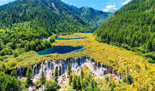 诺日朗瀑布瀑宽270米,高24.5米,是我国大型钙华瀑布之一,也是我国最宽的瀑布。藏语中诺日朗是伟岸高大的意思,诺日朗瀑布的意思就是“雄伟壮观的瀑布”